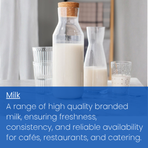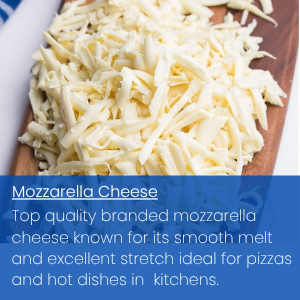 A wide range of dairy products, including milk, cheddar, mozzarella, grated cheese, and more delivering consistent quality and reliable performance for restaurants, takeaways, and food service businesses.